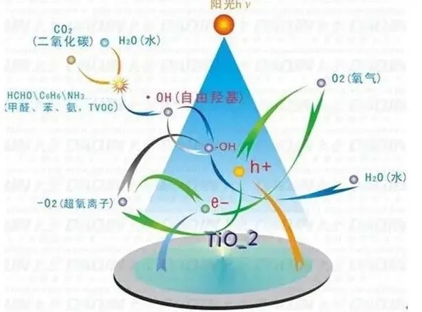凈化原理:在光源照射下,光觸媒能夠利用特定波長(zhǎng)光源的能量產(chǎn)生催化作用(氧化還原反應(yīng)),使周?chē)难鯕饧八肿蛹ぐl(fā)成具高活性的自由基,這些自由基,也有說(shuō)法叫"光等離子體",幾乎可分解所有對(duì)人體或環(huán)境有害的有機(jī)物質(zhì)及部分無(wú)機(jī)物質(zhì)。(光觸媒,也稱為光催化劑,是一類(lèi)以二氧化鈦為代表的,在光的照射下自身不起變化,卻可以促進(jìn)化學(xué)反應(yīng),具有催化功能的半導(dǎo)體材料的總稱。)