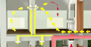 新風(fēng)系統(tǒng)是開放性的循環(huán)系統(tǒng),由風(fēng)機、進風(fēng)口、排氣口和各種管道和接頭組成。風(fēng)機通過管道與一系列的排風(fēng)口連通,啟動風(fēng)機,讓室內(nèi)形成負壓,室內(nèi)受污染的空氣經(jīng)過排風(fēng)口及風(fēng)機排向室外,室外新鮮空氣經(jīng)進風(fēng)口進入室內(nèi)。