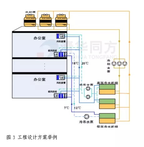 基于上述原理的設備和系統設計有多種多樣。圖3為該系統應用的一種較典型的工程設計方案。在該系統設計中,集中設置高溫冷水機組和低溫冷水機組。新風機組為雙冷源機組,高溫預冷、低溫除濕,末端循環系統采用高溫冷源,實現干工況運行。