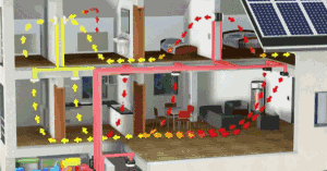 ▲夏天模式:經過高性能空氣質量交換器(熱轉換器)置換凈化預冷的新鮮空氣進入室內。