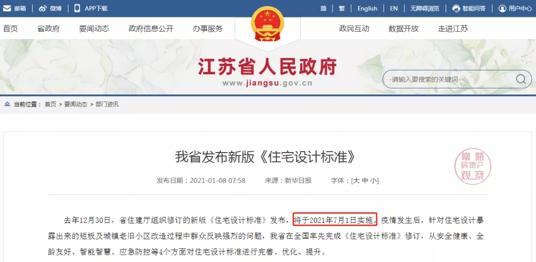 不久前,江蘇省新版《住宅設計標準》發布,從安全健康、全齡友好、智能智慧、應急防控等4個方面對住宅設計標準進行完善和提升,并于2021年7月1日正式實施!